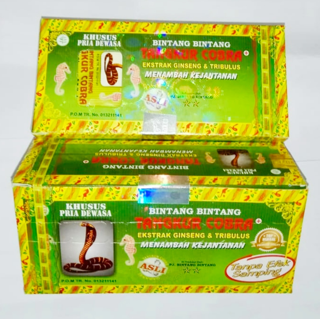 Produk ini Adalah Jamu Herbal Tangkur Cobra Serbuk Obat Kuat dan Tahan Lama Pria Dewasa kemasan 1 kotak isi 20 sachet.